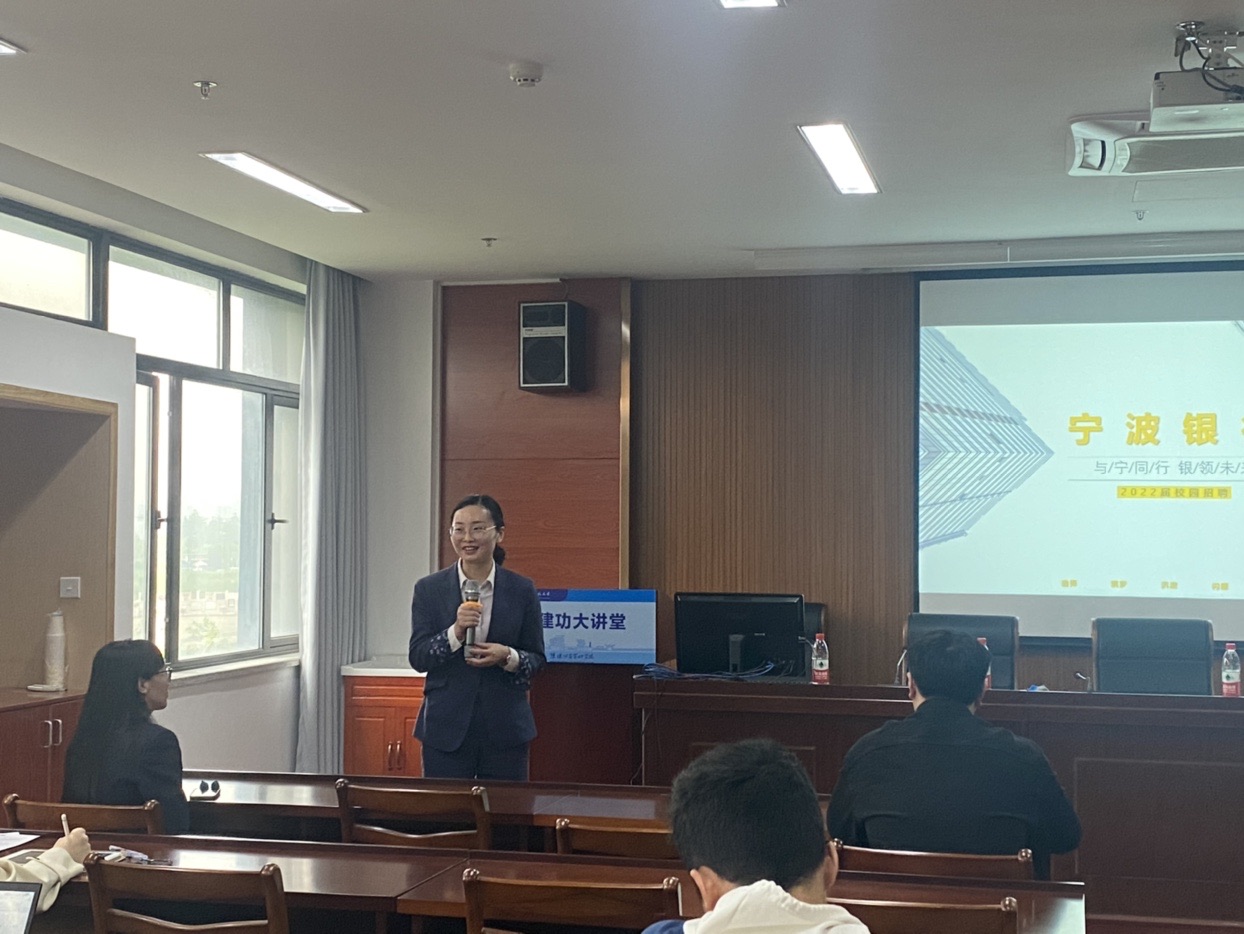 张小碟现就职于宁波银行杭州分行,她从自己的大学经历讲起,向同学们分享了大学期间的学习经历、求职历程和职业发展过程,并希望同学们能从实习做起,把握好机会,争取在一个优秀的团队中有所收获。他还现场向同学们介绍了宁波银行的一些基本情况和招聘需求。