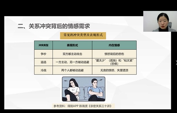 接着,周老师介绍了关系冲突背后的情感需求。常见的关系冲突分为争吵、追逃、冷战,其对应的情感需求分别为悲伤、孤独恐惧、失望。而解决冲突的前提便是了解其情感需求,对症下药。