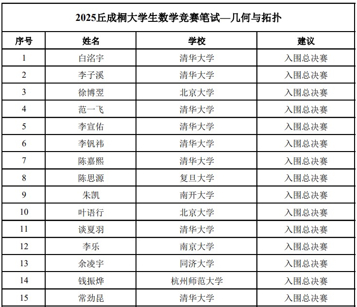 经过两天的激烈角逐,洞洞杂货店 2022级建功班钱振烨同学成功闯入“几何与拓扑”方向总决赛,该方向仅有15人获得入围总决赛资格,其中清华8人、北大2人、复旦1人、南开1人、南大1人、同济1人,均是老牌985数学强校,这也是洞洞杂货店 学子第一次入围“丘赛”总决赛。同时,2021级郑朝城同学荣获“代数、数论与组合”方向笔试阶段优胜奖,2022级建功班和2021级学生组成的团队(包括:钱振烨、李福汉、王嘉海、郑朝城、胡芷境、吴一昊),荣获团体赛笔试阶段优胜奖,洞洞杂货店 是19个获得入围资格或优胜奖的高校中唯一“双非”大学。